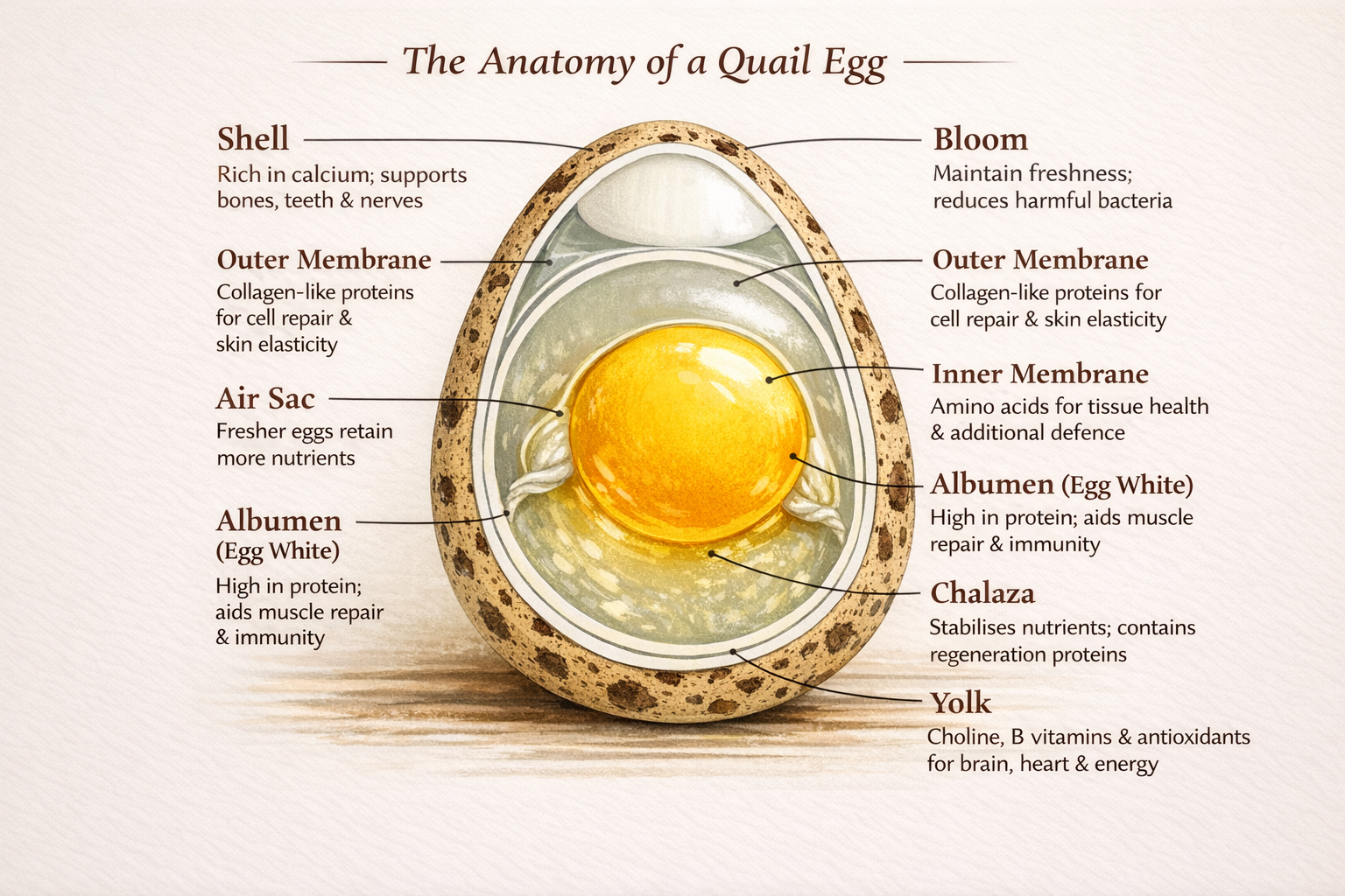 Each quail egg is a beautifully designed natural nutrient capsule. The shell delivers essential minerals, the white fuels muscle and immunity, and the yolk powers the brain, heart, and energy levels.